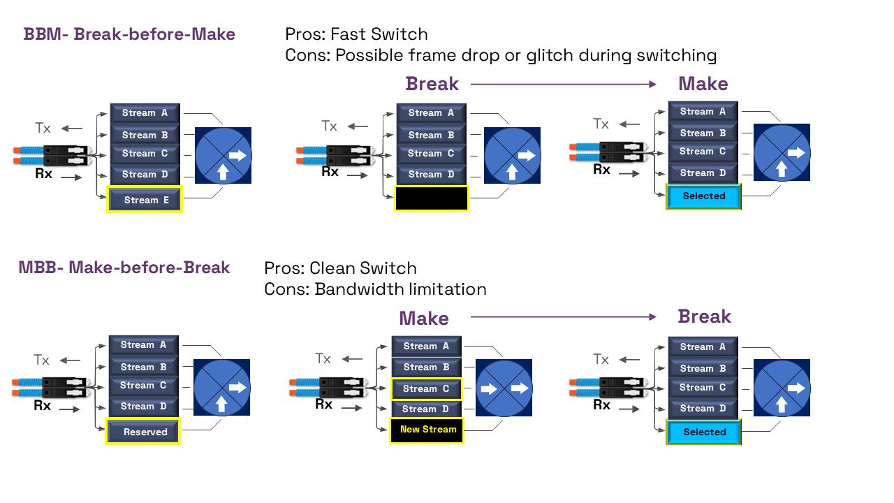 - "Make-before-Break" “MBB” is a seamless video switching method where a receiver prepares a new incoming stream (video, audio, data) while still actively playing the old one, ensuring zero disruption by only switching when the new stream is fully locked and ready, Once the new stream is fully synced and ready, the receiver switches, creating a clean, frame-accurate transition without visual interruption, which is a key feature for professional, glitch-free IP media workflows.