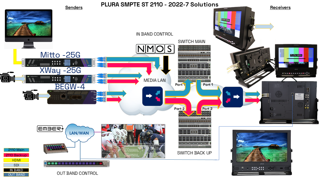 - ST 2022-7 (Redundancy): Enables sending the same video/audio/data streams (essence) over two separate network paths. If one path fails, the receiver seamlessly switches to the other without interruption, ensuring continuous picture/sound.