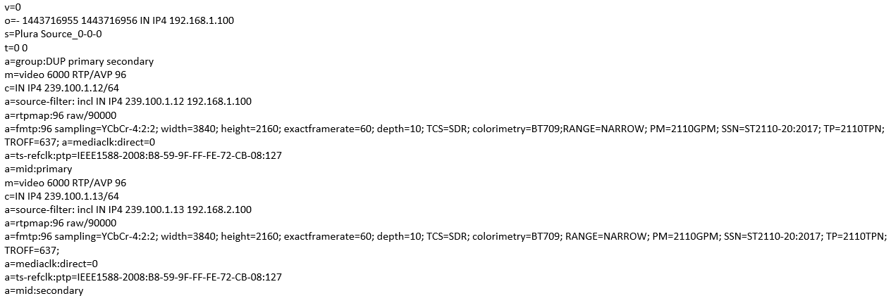 | a=fmtp:96 sampling=YCbCr-4:2:2; width=3840; height=2160; exactframerate=60; depth=10; TCS=SDR; colorimetry=BT709;RANGE=NARROW; PM=2110GPM; SSN=ST2110-20:2017; TP=2110TPN; TROFF=637; a=mediaclk:direct=0 | /Video Metadata + 2110 version (-20) - Primary |